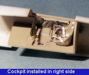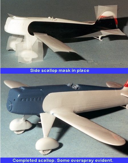 Now it was on to the big side pieces. Obviously these were notmeant for the Classic Airframes kit as they are too big to fit properly. Eachlarge side piece was juggled into position and then burnished down with afinger. The right side was particularly troublesome as there is a bulge right onunder where the leading edge of the mask goes. Anyway, the rest of the airframewas masked off with tape and then the nose section was sprayed with RLM 25 bluefrom Xtracolor. Once the paint was pretty dry the masking was removed. Overallit did a pretty good job, though there was some inevitable overspray and theright side scallop isn't very good, mostly due to the fuselage fairing that interferedwith it. A bit more masking and respraying was able to take care of the problems.Then removal of the masking tape also removed some of the blue on the spine andthat had to be redone. Once that was completed, it was on to the next step.