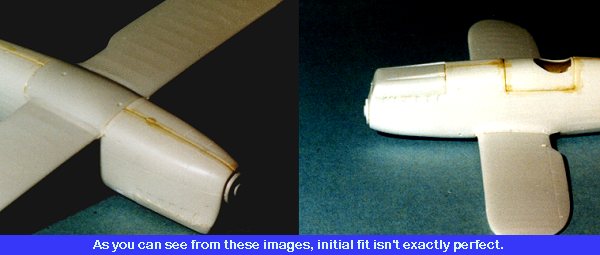 Then the lower wing was installed. I had foreseen a poor fit for most of the parts and I was right. After those components had dried, the gross fit problems were hacked down with a 150 grit sanding stick and the lesser ones were slathered liberally with filler.