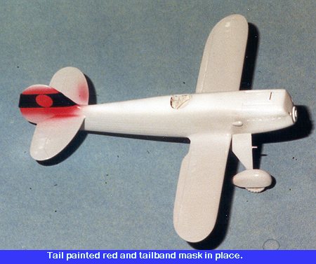 Once the mask was in place the tail was painted with RLM 63 greyand then the center was painted white. Asking Model Master white to cover glossred would be too much. Once that was dry the center was covered up and the tailsection resprayed with RLM 63. The next day the masking was taken off. Well,this stuff prevented any bleed through and also took up the red paint on thefront and rear of the tail section. That means a respray of that area in thenear future.