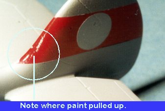The next thing was to paint the tail red in preparation for thetail band mask. I used Tamiya Acrylic red for this purpose. Aeromaster does giveone the decals for this, but I figured I spent the money on the masks so shoulduse it. Once the paint was dry, the mask was applied. It sticks very well,though it wasn't a perfect fit. Fortunately, there is lots of extra maskingmaterial on the sheet. The instructions state that once the packet is opened,the stuff has a shelf life of about a year. Appears I'll be doing another He-51!