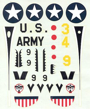 The instructions for the kit are well done and a combination of exploded view and written construction advice. All of the parts are named so you won't miss any. No painting information is given at all. What is given is the recommendation of "If it is desired to further decorate the model by painting, the Cover of the Box....may be used as a guide...". The decals that come with the kit are well printed and still look to be in great condition, despite the passage of time. The modeler will have to paint all the white parts of the unit markings, but the black areas are provided as decals. I'm thinking the markings are for the 34th FS at March Field.