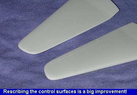 Once those werefilled and cleaned up, I took another look at the wings. The control surfacelines on this kit are about the same size as the rest of the engraved lines.They really need to be deepened. Taking my scriber, I ran it across the controlsurface lines a few times to deepen them. The result is quite an improvement.