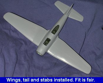 The next step was to install the flyingsurfaces. To make sure that they were all square to each other, they were allglued on at the same time. Fit wasn't bad. There were gaps at the wing/fusealgejoin and the fin/rudder didn't fit all the way down to the fuselage in the back,but this was to be expected. That is what filler is for! The wings were also abit thinner than the wing root, but again, filler to the rescue!