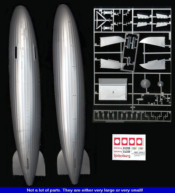 Revell's kit of the Hindenburg is the first that I have ever seen and it is done completely in injected plastic. Before the only other airship kit I know of is the very rare AMT kit of the Akron/Macon, and that kit has, I believe, a vacuformed envelope. It is also a bigger kit. The Revell Hindenburg is what seems to be a return to the old 'box scale' kit where the kit is no bigger than a standard sized box. However it's scale of 1/720 is close enough to the standard Waterline ship scale of 1/720 to make no difference and it produces a kit that is relatively easy to display.