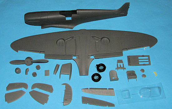 The resin parts are superbly molded with a complete fuselage and nearly complete wing being the two larger molds. I did find a number of small air pockets on the leading edge of the wing where it had been attached to the pour stub. Some had been filled with super glue, but I can tell it will need more work. Other resin bits are the control surfaces, wheels, prop and spinner, and some cockpit parts. Two rubber tires are included as is a single vac canopy