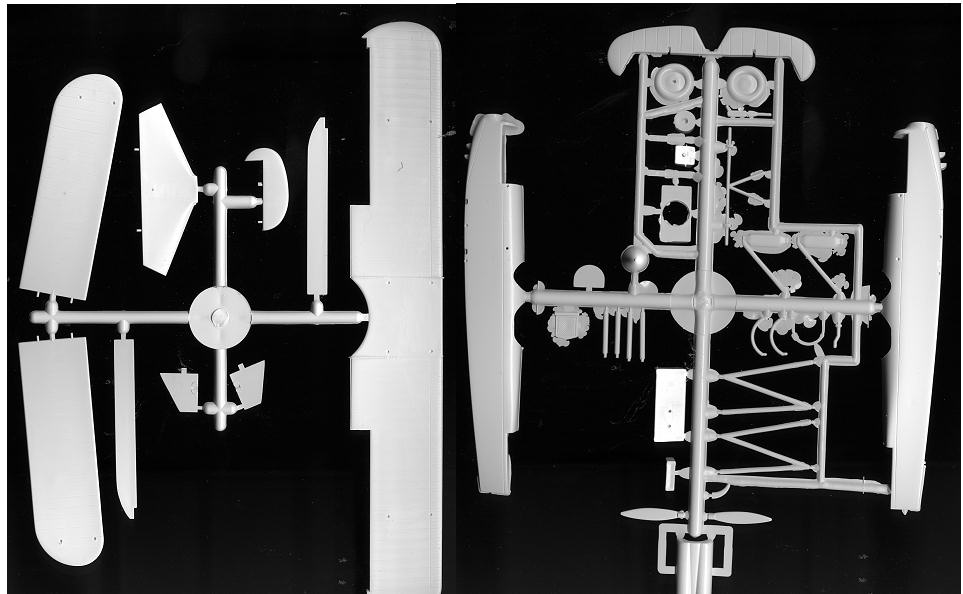 Though not really high tech, the kit is fairly well molded. The upper wing is a single piece, though obviously a triple casting as there is flash between the outer wing panels and the center section. Separate ailerons have some engraved detail on the upper surface and none at all on the under side. The kit also has a separate one-piece rudder, one-piece elevators and one-piece horizontal stabilizers. Oddly, the small fin is two parts.