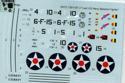 Decals are provided for three aircraft, all 'yellow wings' planes with most of the airframe in silver dope. Despite only building 27 of these planes, they did serve with several units. VF-4,5, and 6 are included in the three markings options, each with the usual color in the cowling and the tail section. VF-4 is mostly light green and Black, VF-5 is mostly red and VF-6 is mostly blue and light green. All make for quite colorful planes Decals are well printed and appear to be quite thin. Though the builder has to paint the cowling, wing, and fuselage bands, the sheet includes the thin pinstriping.