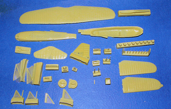 Olimp kits come in rather sturdy boxes. Mine was even more protected by having Styrofoam sandwiched inside the box to keep the bits from moving around too much during shipment. Despite all this, a few bits came adrift from the resin pour stubs, but nothing was damaged. The parts are quite well molded and though I saw a few air pockets, they should be easy to fill. The wing leading edge is a bit ragged, but this is probably where it attached to the pour stub. The lower portion of both fuselage halves has a large lip that will need to be sanded down prior to construction. Some other clean-up will be needed as with all resin kits.