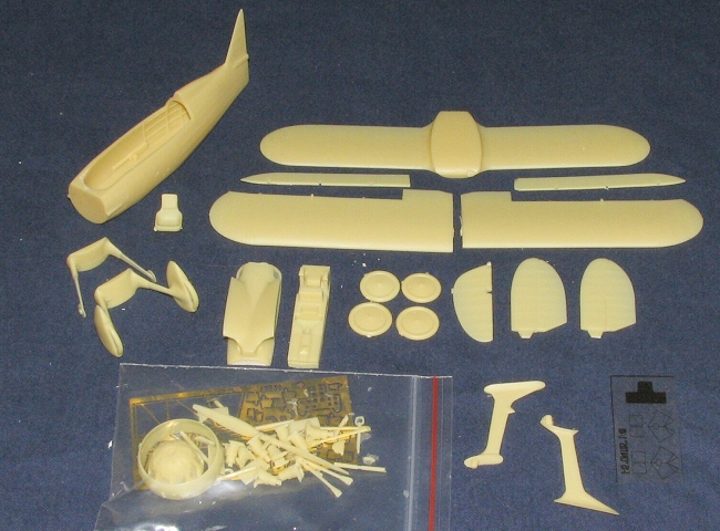 The engine consists of a block and separate cylinders, each cylinder superbly molded and complete with exhaust stub. Much of the interior detail is done in photo-etch. An acetate instrument backing is provided for the p.e. panel and a card panel which you'd cut out and paste in place is also provided. The interior is quite well detailed and you basically make a cage out of the resin floor and p.e. sidewall detail, much the same way as is done with the Mirage PZL 11/24 kits.