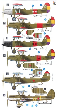 Instructions are top-notch with 14 construction assemblies. Interspersed are detail drawings for how various parts of the aircraft should look when you are done. Rigging information is given, and while not a totally simple aircraft, it should pose little problem for those who have done a few biplanes. The modeler will have to make a few simple things out of stretched sprue such as gun barrels, but nothing major. Markings are provided for six aircraft. All in Russian Green over Russian Blue. A color profile sheet is given to help choose which one wants. There are basically four from the Spanish Civil War and two Russian aircraft. One must be a demonstrator or something as it is very nicely done with a white flash down the fuselage side, yellow wing and fuselage bands and wheel pants. Decals are very nicely printed and quite thin. I'm not sure how opaque they are but the ones on the I-5 looked just fine.