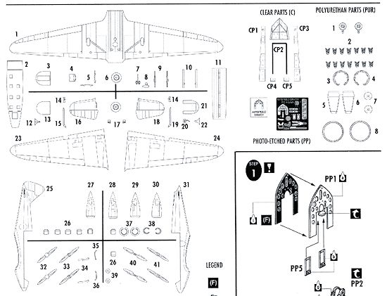 Each of the main landing gear assemblies looks rather complex and consists of four pieces per side. Detail drawings are supplied. Each kit has four sets of prop blades. Two sets are different pitch from the other two and in this case, the instructions are specific on which markings option uses which blades.