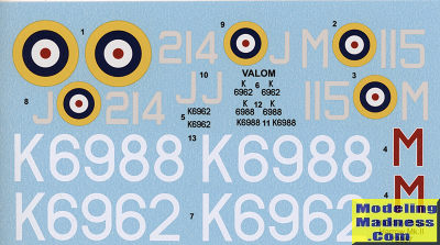 Instructions are fairly well done with a detail image of the interior. Generic color information is provided along with color numbers for five other paint makers. Both planes are dark green/dark earth over black. Markings are for two planes. One is the armed box art plane from 115 squadron. The other is a near identical plane that is unarmed from 214 squadron. Decals are superbly done and should work just fine.