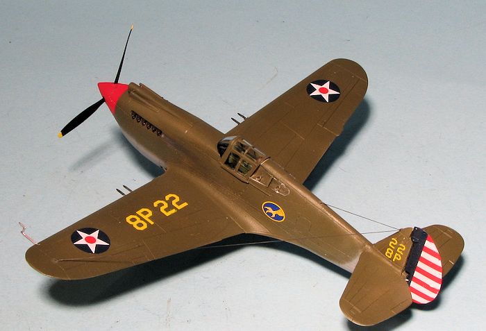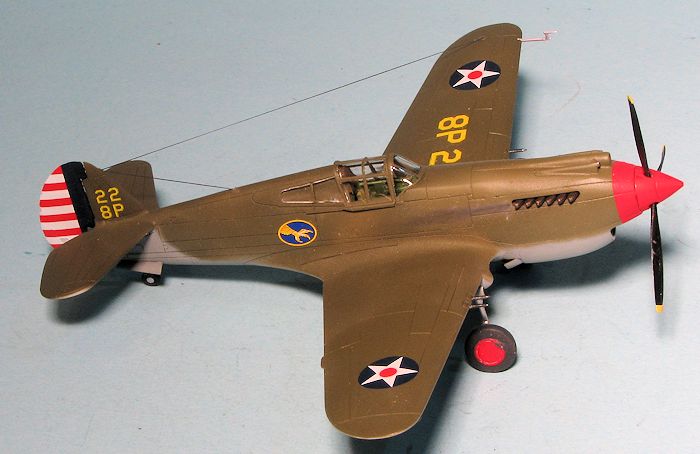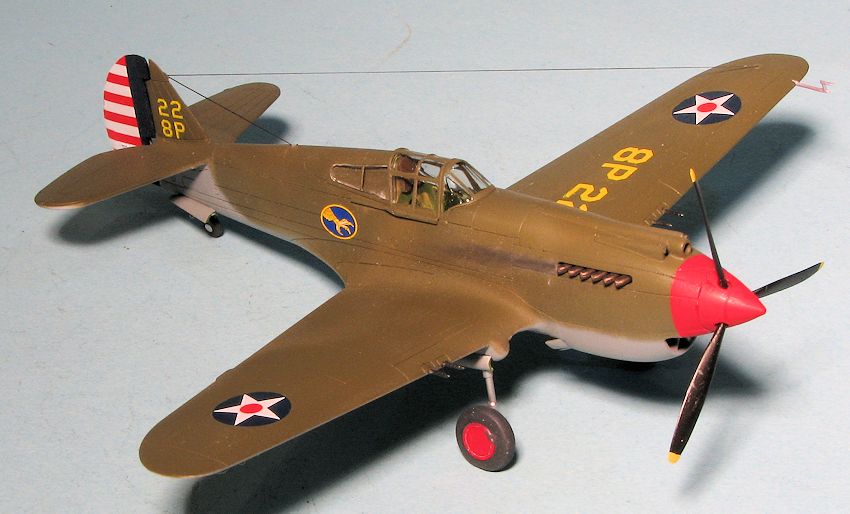 I was going to use another FCM decal sheet for this one and chose FCM 72-022 which had markings for two pre-war P-40s. I picked the one for the 33rd Pursuit Squadron in 1941. This plane has a red forward cowling and wheel covers, so those items were first painted white then red. After masking, I used Testors Model Master enamels for the olive drab and neutral grey scheme.