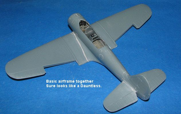 I filled and filed the fuselage halves and then attached the tail planes. Next, the lower wing center section was glued in place after removing some rather large flash on the rear fuselage opening. The upper wing halves were also attached at this time to be sure that things were level.