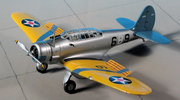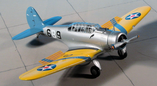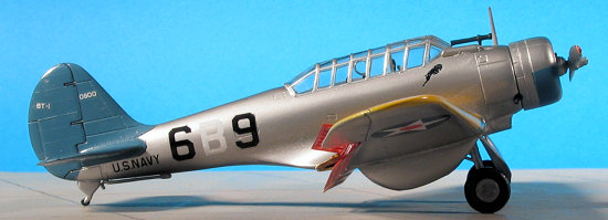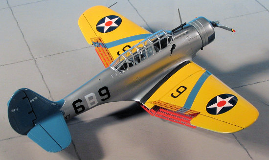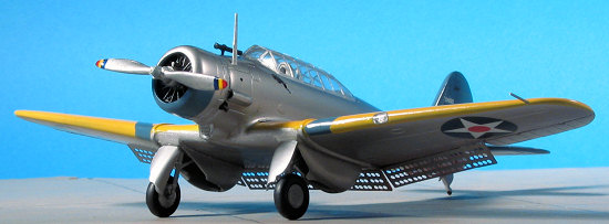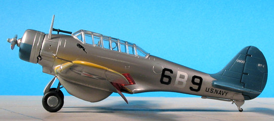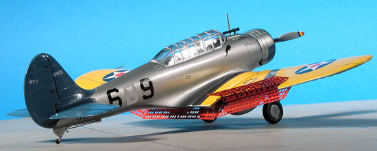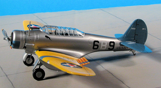 The next iteration of the BT, designated the XBT-1 was equipped with a 750 hp R-1535 engine. This aircraft was followed in 1936 by the BT-1 that was powered by an 825 hp Pratt and Whitney R-1535-94 engine. 54 aircraft were built, more than enough to equip two squadrons, one aboard Yorktown and the other aboard Enterprise. Other ships used the Helldiver biplane or the later Vindicator. One of the BT-1 aircraft was modified with a fixed tricycle landing gear and was the first such aircraft to land on an aircraft carrier.