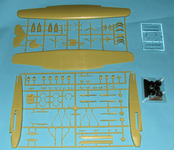 There are two large tan sprues, one clear sprue, a bag of resin and a small etched sprue. Starting with the resin, this is for the engines, wheels, guns and a few other small bits. Photo etch is used for a number of small cockpit details including belts and an instrument panel. There are also a number of p.e. parts for the exterior. The clear sprue includes the windscreen and cabin windows, with an alternate set that is not used. The sprue is well molded.