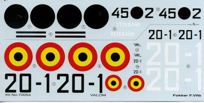 There are markings options for two planes; one for the Nationalist forces in what looks like standard Luftwaffe colors of RLM 62/63/64/65 as shown on the box top. The other is a Republican aircraft with basically an aluminum dope fuselage and green upper wing. The decals are superbly printed and before you wonder if the center of the Republican roundels is black, well it is on the main sheet. Valom realized the goof and a second set of roundels with the dark purple center is in with the kit.