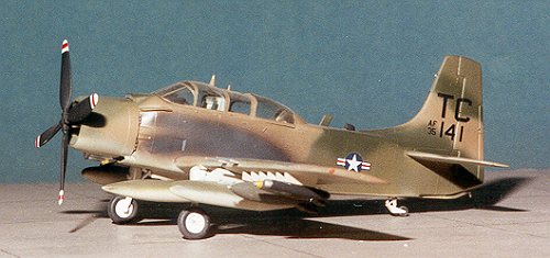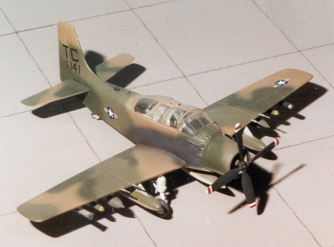 The A-1E was, like all Skyraiders, originally a Navy design usedas a trainer and as a COD (Carrier Onboard Delivery) aircraft. Unlike mosttrainers, this one was able to carry a full load, same as the regular ADs (laterA-1s). During the Vietnam war, the A-1 was looked upon as an angel of mercy bydowned aircrews. Their main task was to loiter above the crew on the ground andkeep the bad guys away from the rescue helo. The A-1s ability to stay on stationfor hours, relatively slow speed, and to carry a wide assortment of ordnancedesigned to deter the enemy helped ensure the survival of a number of aviators.It was replaced by the A-7D, an aircraft that just wasn't as well suited as theA-1.