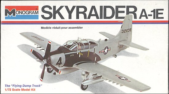 Monogram's kit of the A-1E is one of the few 1/72 aircraftthat Monogram did back in the late 1960s/early 1970s. These kits were all easyto build, had minimal parts, and pretty good detail for the time. They also allcame with stands, something one just doesn't see in kits today. There is someordnance but not nearly enough. Basically you get three drop tanks and are onyour own to find other things to fill the built in bomb racks.