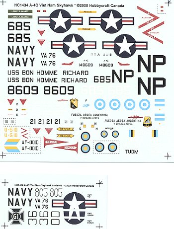 On to the decals. They are beautifully printed and razorsharp. Hobbycraft has really improved their kit decals and they are a pleasureto use. These seem no different. There is even an addendum to take care of adecal glitch. Nice touch. You get four aircraft. One USN, two Argentine and oneMalaysian bird. Having the painting info on the back of the box is a great idea.Two little things. One is that it would have been nice to have an upper fuselagedrawing of the Malaysian bird instead of just wings and stabs. Second is thatthe markings on the Argentine and Malaysian bird are almost invisible whenprinted over the dark brown or greens. I had originally thought that themarkings for Swartz's Mig killing plane were incorrect. It appears that this isthe scheme used during the BHR cruise when the kill occured. Most othersources show the later Independence cruise markings which are muchdifferent. There is also some thought that the color of the markings isn't blackbut a dark green. More research into this is really needed.