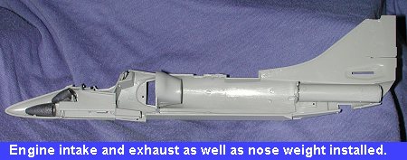 Getting back to the fuselage, the engine intake and the exhaust sections were glued together and then glued into the fuselage. Not sure how much weight was needed, I overdid