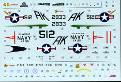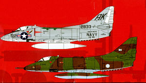 art plane of VA-95 'Green Lizards' that operated from the USS Intrepid in 1966 when it was an ASW carrier. Not unusual is that these markings are the same as the A-4B displayed today at the Intrepid Museum in New York City. The other is C-240 from 5 Gruppo in April 1982. This plane is in two browns over light blue and without the 'Malvinas bands' worn by some aircraft at the time. The decal sheet includes full instrument decals and a complete stencil suite. Color placement and painting instructions are provided in the instruction sheet.