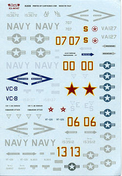 It is obvious from the generic TA-4J instructions that there will be many more boxings. The sprue has open areas for the guns when one does a TA-4F and I should point out that it was not uncommon to see TA-4Js also armed. However, none of the Aggressor aircraft were and that is what this boxing is all about. 16 well drawn construction steps are provided with generic color references for wheel wells, cockpit and so on. There are four decal options, all aggressors from the early/mid 1980s in various schemes. The separate markings guide does provide FS 595 paint references. First off is the box art plane from VA-127 in Dark Green, Grey and Light Brown. Next are two VF-126 aircraft. One is in Medium Blue Grey and Light Grey while the other is in Dark Green, Mediuim Green and Sand Brown with Light Grey wing undersides. Finally, from VC-8 is one in Dark Blue-Grey, Medium Glue-Gry and Light Blue-Grey. Decals are nicely printed by Cartograf in Italy. The decal numbers are missing from the sheet so an addendum sheet was added. As you can see from the image above, it was not uncommon to find aircraft with replacement slats and the paint was often retouched several times, making for interesting schemes.