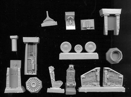 There is the usual bag of resin parts and these are superbly molded. They are what could be considered 'old school' resin with the large pour stubs. The ESCAPAC seats are especially nicely done with molded on harness and the 'head knocker' in the down position as it