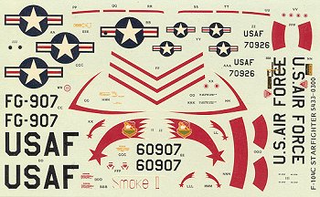 The instructions are amongst the best in theindustry giving clear construction steps and any colors needed shown duringthese steps. There are two possible camouflage options. One is for an F-104 inoverall aluminum with colorful markings from the 479th Fighter Group. The otheris a South East Asia camouflaged aircraft as was sent over to Vietnam to supplybase protection. The decals are very colorful and very glossy. Some folks havehad trouble with Monogram decals so it wouldn't be a bad idea to have someaftermarket ones around if needed.