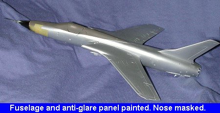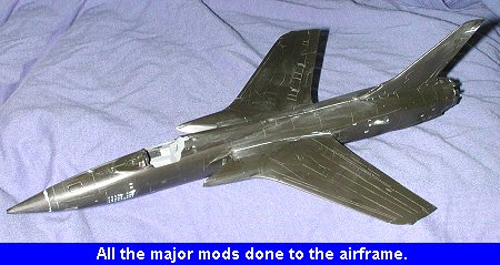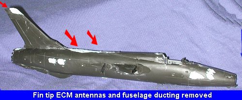 At this time the wings were also glued together and set aside until later. Back at the fuselage, there were a number of modifications still left to do. The biggie was to remove the upper spine ducting. This was accomplished by using a lot of sandpaper and final smoothing. The ECM antennas on the fin tip also need to be removed as these were later additions and not germane to the early Thud.