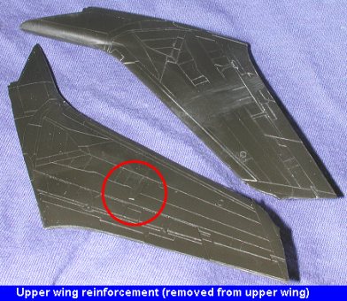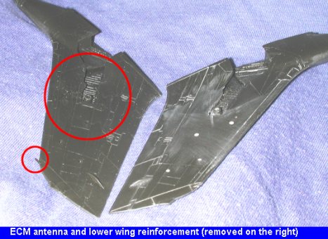 The wings also needed to have some work done on them. Combat stresses had causes some minor cracking, especially around the wheel wells so reinforcement plates were added on. These have to be sanded off for an early bird. You can see the rather large area for this reinforcement on the underside by what I had to remove. The kit also includes some ECM antennas that are not seen on the 105D. They are, however, used on the 105G Wild Weasel, and as you may know, Revell-Monogram do a 1/72 F-105G. Anyway, they need to be removed. In case you hadn't noticed, the OD plastic was a real pain to photograph!
