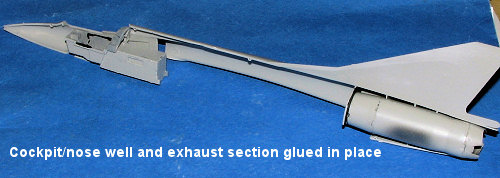 The exhaust section was also completed and then both it and the cockpit section was glued into the right fuselage side. I then added a bit of nose weight and then the instrument panel before closing up the halves.