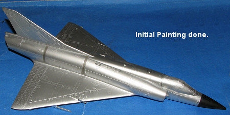 During all this I'd been taking care of the smaller bits like painting the landing gear, assembling the wheels, assembling the big Matra missile and cleaning up the rather clunky Matra Magics that are supplied. There are several scoops and other bits like the wing tip formation lights that need glued, sanded and masked. I also attached the windscreen and tacked the canopy in place. The windscreen is too narrow for the opening and the canopy does not fit well in the closed position. These items had been premasked and now it was time to paint.