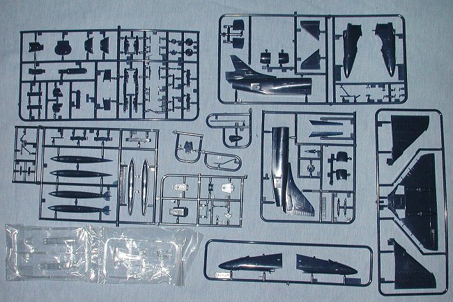 Molded in dark blue , there are enough bits and piecesto make either an A-4E/F or a TA-4J. There are both single and multiple piececanopies supplied as well as the option for the speed brakes to be open orclosed. There are also underwing and underfuselage fuel tanks provided. Leadingedge slats and trailing edge flaps can be displayed in the lowerd position ifdesired. The cockpit is quite complete with instrument panel and console detailsbeing provided by decals.