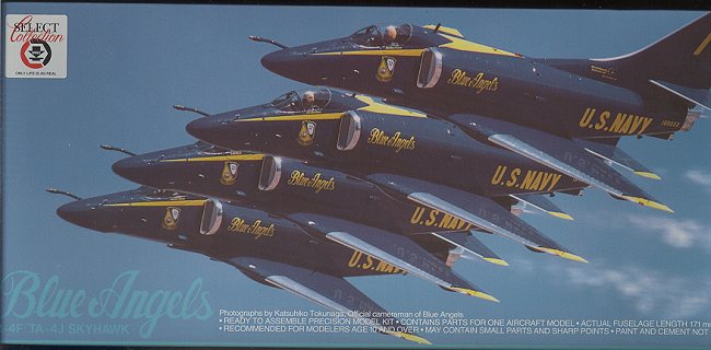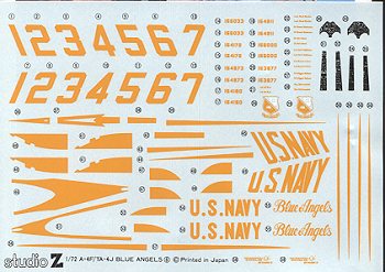 The instructionsare superb, offering clear instructions. There is a separate section for boththe single and twin seater, even though many of the steps are duplicated. Neededcolors are referenced to Gunze paints and shown where applicable. As you mightguess, the only decals provided are for the Blue Angels, however you can modelany of the seven aircraft on the team. These include all the flashes and othermarkings, so you don't have to paint on any of the markings.For those notwanting to do a BA plane, there are enough aftermarket Skyhawk sheets around tolet you do a number of other aircraft. The only problem will be covering up theblue plastic, but a good primer coat should eliminate that problem. The kitdecals appear to me to be a bit too orange when compared to the box top photoand I'm not sure how well they will work against a dark blue background, thoughFujimi decals have shown themselves to be pretty opaque.