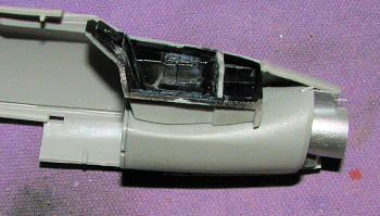 Returning to the fuselage, I assembled the intake/nose well halves after cutting some lead to put into the halves. There is scant room for weight in this kit and I felt I should fill as much as I could, just in case. I did not attach the nose radome as it needs to be painted something other than the silver indicated in the instructions. The intake center section is surrounded with a piece of trunking to which a compressor face is installed in the back. The intake was painted aluminum and the compressor with steel. You would have to shine a bright light down the intake to see the compressor face. This was then fit into the fuselage half and when dry, the cockpit section fit atop it. The cockpit pretty much snaps into place. A bit of space atop the intake had a section of weight attached.