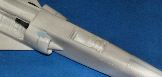 The cockpit was assembled and painted Dark Gull Grey with the seats in various shades of grey and black. I had no trouble with the instrument decals as they did very well with a dab of Solvaset. Fitting the interior into the fuselage halves was a bit of a trial but it was eventually put into place along with the gear bays. I then started to assemble the rest of the fuselage parts. The general fit is not what I'd have expected from a mainstream model company. Few of the parts fit properly and every seam needed filler. Some of the problem was self-induced.