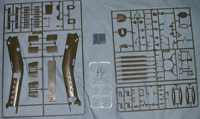 This particular boxing is inolive drab plastic, undoubtedly to assist in ease of painting! Detailing of theparts is quite good, as one would expect from current Italeri kits. The surfaceis slightly 'pebbly' but that will disappear under the first coat of paint. Ihave heard that the cockpit door tracks on the clear part don't line up with thetracks on the fuselage, but that shouldn't be a real problem. You are given fewoptions, those mostly having to do with which variant you are doing. You canattach either drop tanks or rocket pods on the fuselage. The gunship versionalso has a 20mm gun that goes into the cabin door behind the cockpit and whatappears to be twin machine guns that fit along side the nose gear.