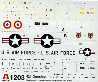 Instructionsare quite good and show all the possible options and colors for the version thatyou are modeling. Color chart gives Model Master and FS numbers. There are threedecal options for this model. Two are French Army in Algeria circa 1957 and oneis for the USAF around 1959. The two French helos are nearly identical inmarking, both being very basic and only one of them having code letters. Theyare painted in overall olive drab. The USAF version is by far the more colorful.It is overall aluminum paint with a red roof and upper fins. The decals are wellprinted and should present no problems in application.