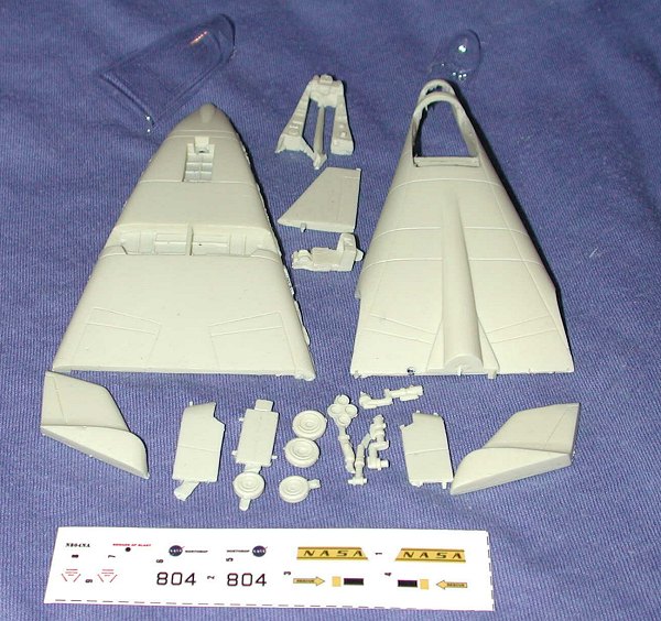 The kit can be built wheels up and the gear doors are molded in that position. Several of the small door attachment arms have been broken off during shipment so care must be taken when cutting the doors not to damage what is left. There is no mention made of nose weight, and I don't think any will be needed as the landing gear is rather well-spread apart. However, when the kit is being made, I'll definitely be making sure it isn't tail heavy! Thanks to the design of the fuselage, no worries on filling a seam running down through the interior on this one. Though no pitot tube is provided or shown in the exploded view, the HL-10 had a very prominent one that the modeler will have to make from stretched sprue.