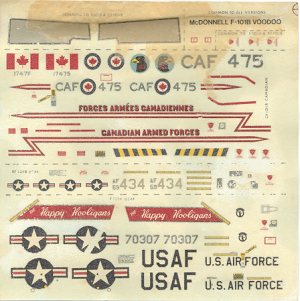 The kit did come with a nice variety of markings. Unfortunately for me, this kit (which was part of a package deal of models) had gotten damp and so the decals were ruined. However, you can still tell that there were decals for an F-101B from the Happy Hooligans of the 178 FIS, North Dakota ANG, and 409 Squadron Canadian AF in overall light grey. There was also a separate nose section as the kits only real option and that was for an SEA painted RF-101B from the 192 TRS, Nevada ANG.