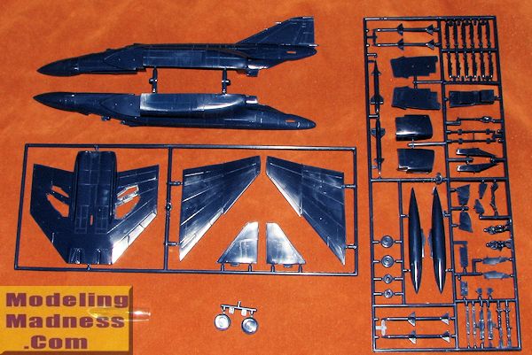 Apparently there are only a few ways of doing F-4 intakes and so this has the usual separate splitter plate with inside intake piece with a separate outer section. Once the fuselage halves are assembled (nose well is shallow and molded into the fuselage halves), the lower wing center section out to the wing fold is attached. The uppwer wing includes upper and lower outer wings. These wings are flat as in an F-4A/B with no bulge. Same with the main gear doors. Tires are the skinny versions with generic wheels. Nose wheels are dished. The nose gear doors are basically flat rectangles and the main gear doors are similarly flat. You do, however, get separate speed brakes. No retraction mechanism for any of the gear or speed brakes.