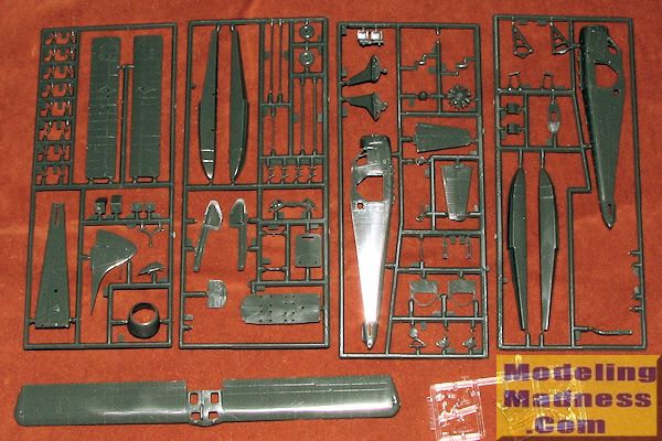 The interior consists of two forward seats, two middle seats (the ones with the backs removed on my kit), and a rear bench. There is s single piece double control column and an instrument panel. I mentioned the thickness of the transparencies so no worries if you don't put a lot of effort into the interior. If you do, the two cabin doors are separate items so you can pose one or both open. The wings are a single upper piece and two lower halves. There are separate control hinges and what look like small bomb racks for the left wing underside. Probably for message containers (or beer kegs).