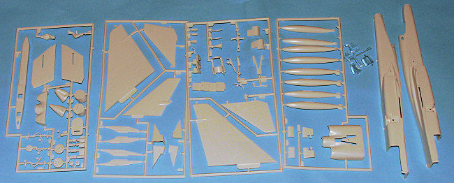 The fuselage is split vertically with separate sections for the rear. This is to allow the builder to install the operating tail hook and movable stabilators, though one would be wise to cement these firmly in position as there is no hook well, only an opening. Wings are mostly one piece with a small inner section that has the slots for the wing pylons already installed. Like the Hasegawa kit, the wheel wells are small in that the doors normally closed are so molded. The camera 'canoe' is separate and once the clear bits are glued in place, is simply attached to the bottom of the fuselage. The wing pylons carry four