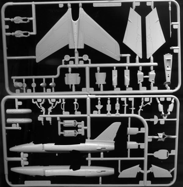 Like most new Airfix kits, this one can be built in flight, though one has to order a stand separately. Wings are three piece with the upper section being a single molding. Holes will need to be drilled in the two lower sections if one wishes to use the wing tanks. These are three pieces with a solid nose section. The kit includes two crew figures