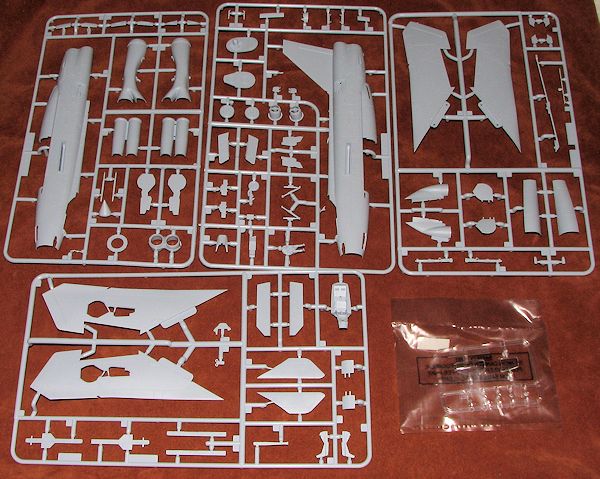 Long burner cans are provided with an exhaust compressor blanking plate on one end and the burner petals along with the exhaust plate on the other. These are then sandwiched in between the fuselage halves. The front part of the belly tank is separate and contains the two part forward section without the guns. Wings are in upper and lower sections and one must open holes for the refueling probe. Separate flaps and provided which is a bit of a waste as they were normally in the neutral position except during landing and maintenance.