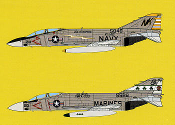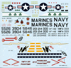 The other two markings are for standard light gull grey and white F-4s. Both of these units have deployed and both got at least one MiG kill during Vietnam. One is from VF-142 in their yellow markings and the other with VMFA-333 'Shamrocks'. Both of these are shown without the intake RWR antennas, which is appropriate for the early fleet use of the F-4J, though I'm thinking that perhaps by the time VMFA-333 was aboard the America, it would have had those added. Check references.