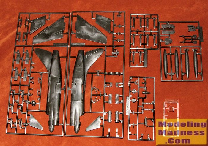 Wings are a full upper surface with an insert for the lower inside. This insert has the two inner pylon areas already drilled out. The outer pylon is a butt join and all pylons are single piece moldings. To model folded wings, the builder will have to do some surgery. To my knowledge, the only 1/72 A-7 that can be built with folded wings is the Matchbox kit. For things under wings you have a pair of drop tanks, a TER and MER with lots of Mk 80 bombs to attach to them. You can also mount either Shrike or Maverick missiles, both of which are appropriate for the USAF version of the Corsair II. I should mention that there are fuselage mounted Sidewinders, but these were frequently not installed so for most cases one shouldn't bother attaching the pylons.