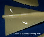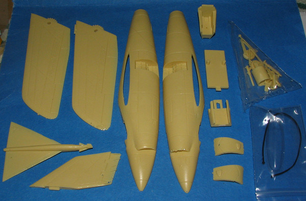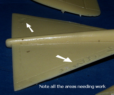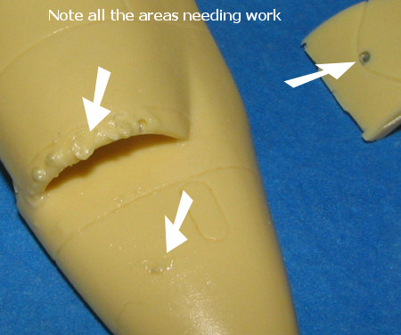 I should also comment on the quality of the molding. My copy suffers quite a bit from poorly molded intake lips with lots of air pockets and just plain resin crud on them. This is also found on the wing tips, the nose, and the rudder portion of the vertical stab. There are also more little