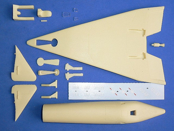 This Anigrand kit of the X-20 is one of the more simple that they have done. This makes it perfect for the beginner to the hobby. You have basically a fuselage upper section, a lower section that includes the wings and the tip fins. Other bits are for the landing skids, interior and the exhaust nozzle. You can build this gear up as it would have been in launch position. There are three clear resin windows to install in the upper fuselage section. The interior is seat, stick and instrument panel section. Not sure how much if any of that will be seen through the tiny windows so you may wish to relegate these bits to the spares box and just paint the interior matte black along with the rest of the airframe.